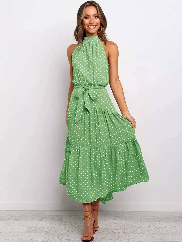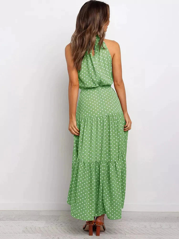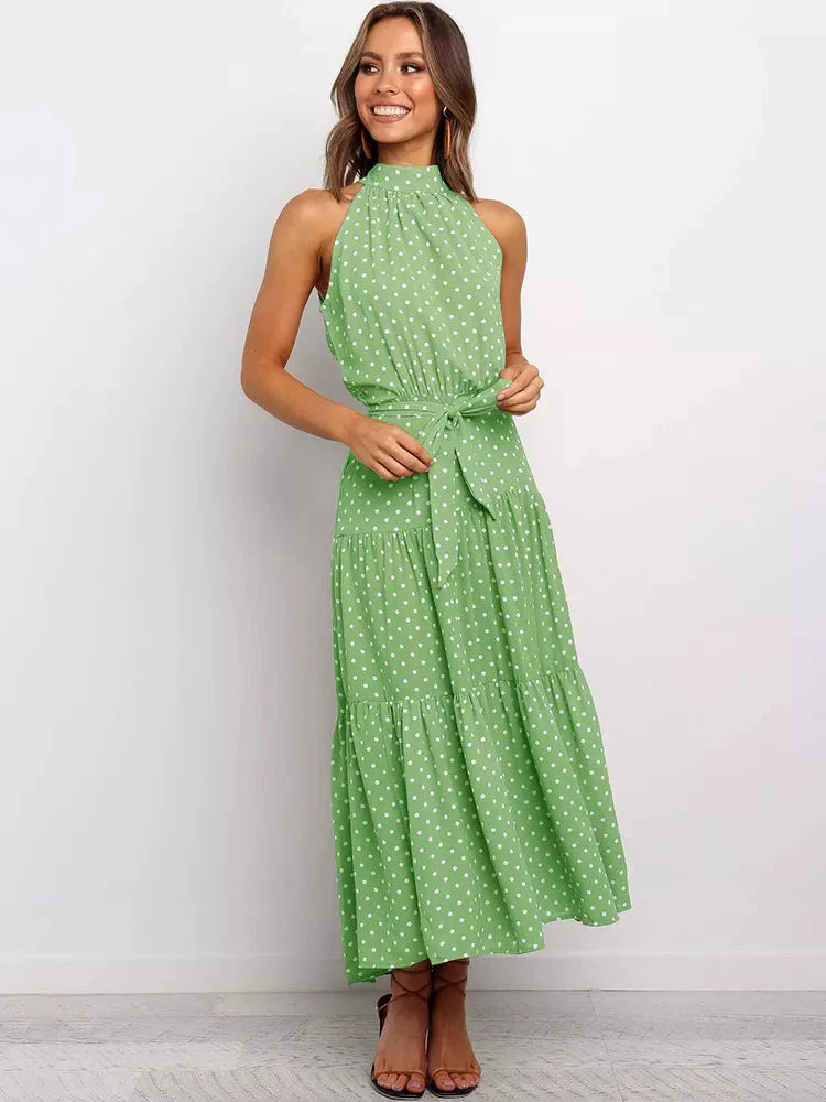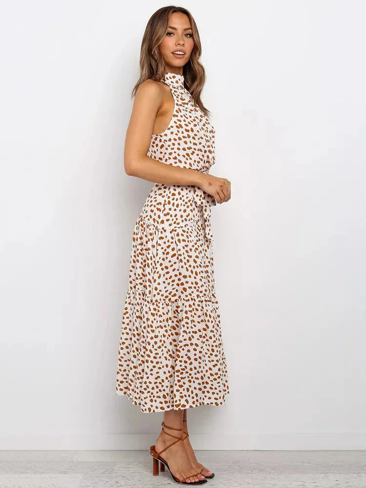 O corte longo e fluido garante conforto, enquanto a estampa de poá adiciona um toque vintage e elegante. A gola alta eleva o estilo da peça, tornando-a perfeita para ocasiões formais, eventos de verão ou jantares especiais.