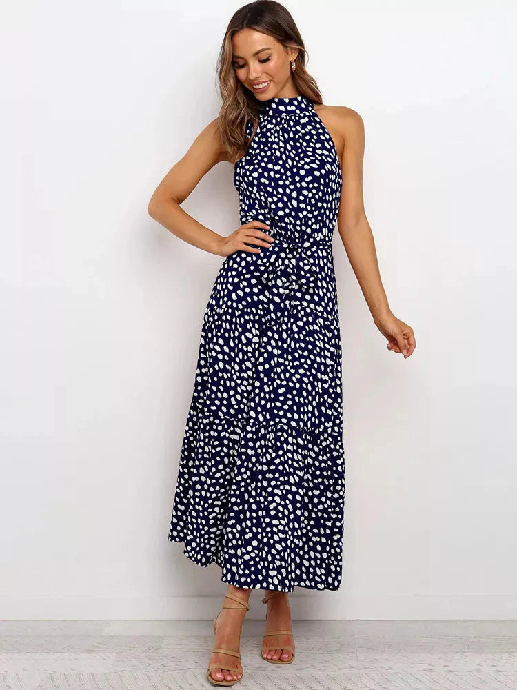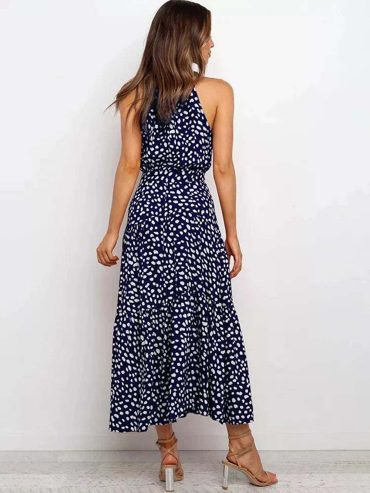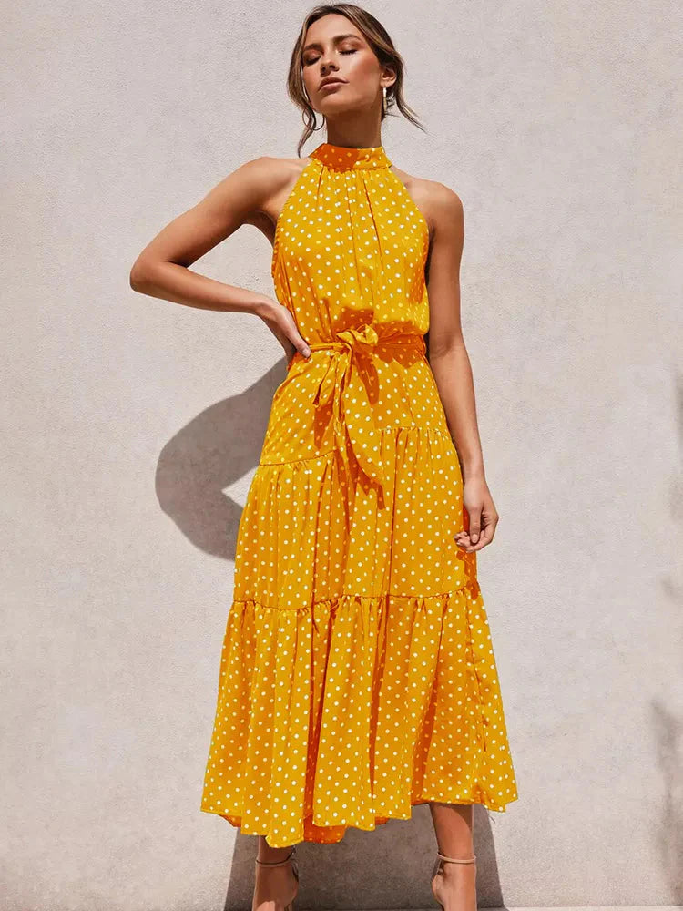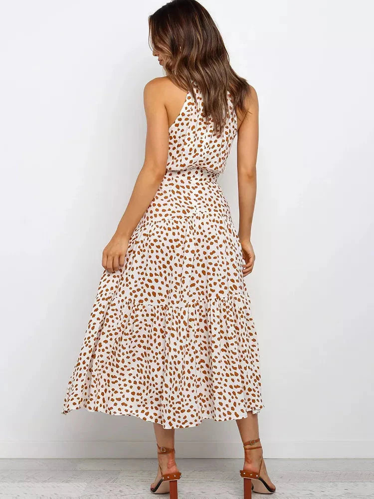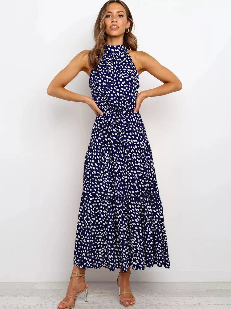 O corte longo e fluido garante conforto, enquanto a estampa de poá adiciona um toque vintage e elegante. A gola alta eleva o estilo da peça, tornando-a perfeita para ocasiões formais, eventos de verão ou jantares especiais.